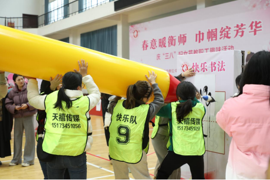 “参加‘三八’趣味活动,让我真切地感受到学校对女教职工和女学生的关怀和重视,更见证了女教职工的蓬勃力量。”2023级新闻与传播学院广告学一班的刘雅萱在活动现场开心地为老师加油。学校的 “三八”趣味主题活动既丰富了教职工文化生活,也彰显了新时代女性昂扬向上的精神面貌。