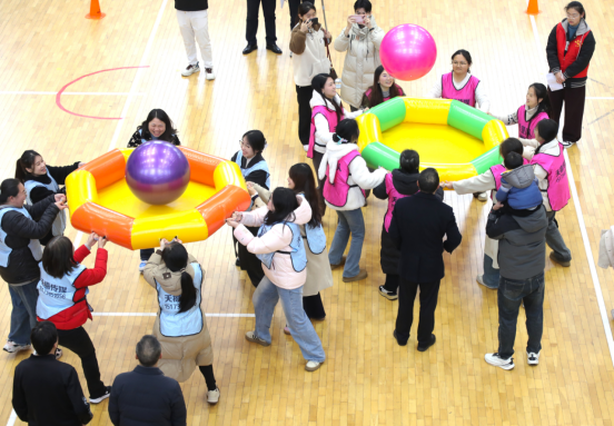 趣味活动共分为“心心相印”“巨人脚步”“众星捧月”“快乐铅笔”四个团体项目。活动现场热闹非凡,欢声笑语不断,大家热情高涨,积极参与,尽情享受着运动带来的快乐。“巨人脚步”比赛中,考验的是团队默契程度,外国语学院的教职工在短暂的尝试后,齐心协力,步调一致,向着终点冲刺,规律的口号和富有律动的节奏,彰显着她们出色的团队协作能力。现场加油声、呐喊声此起彼伏,教职工们携亲带友,纷纷为这场趣味运动会贡献一份活力。